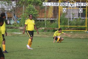 TimurUpdate.com – Tampil Selaku Kapten kesebelasan, Bupati Keerom Piter Gusbager berhasil mencobloskan dua gol bagi tim All Star Pemda Keerom melawan tim All Star TNI/Polri pada laga eksibisi menjelang laga final cabang olahraga Sepak Bola Pekan Olahraga Kabupaten (Porkab) Keerom 2025, Jumat (24/10/25) yang berlangsung di lapangan sepakbola, Arso Swakarsa.